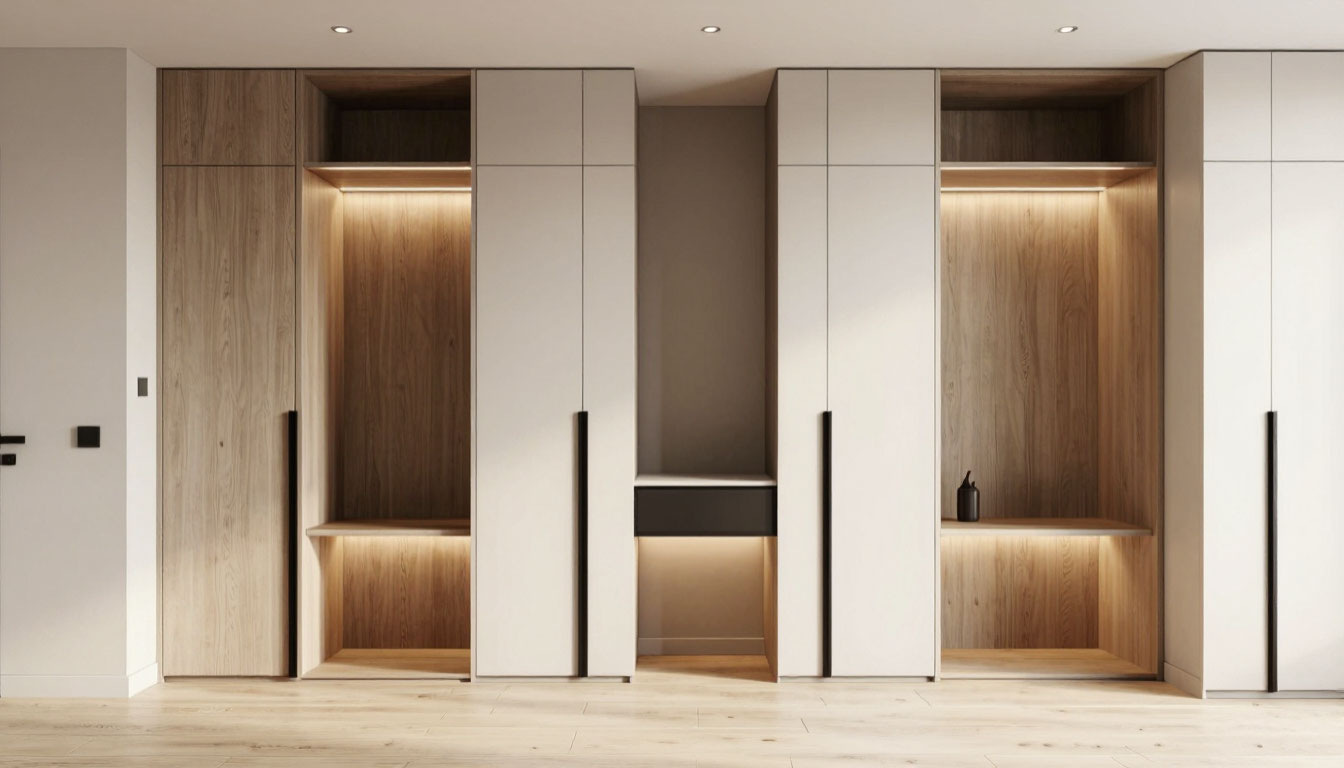 Главный тренд 2026 тотальная интеграция. Мебель больше не ставится к стене как отдельный объект, она становится самой стеной. Дизайнеры называют это «архитектурной мебелью». Шкаф теперь проектируется как продолжение потолка и пола, без зазоров и пылесборников. Такой подход, активно продвигаемый брендами вроде Poliform и Rimadesio, визуально расширяет крошечное пространство типовых прихожих.